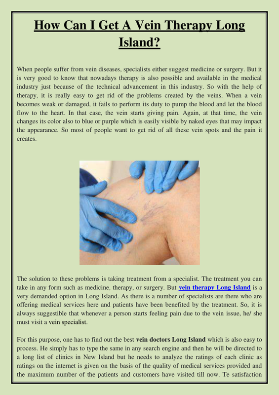 The solution to these problems is taking treatment from a specialist. The treatment you can take in any form such as medicine, therapy, or surgery. But vein therapy Long Island is a very demanded option in Long Island. As there is a number of specialists are there who are offering medical services here and patients have been benefited by the treatment. So, it is always suggestible that whenever a person starts feeling pain due to the vein issue, he/ she must visit a vein specialist.
