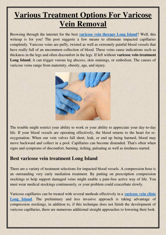 There is a lot of options available for varicose vein clinic long island as many specialists are working here and some of them are practicing also under the experts. In fact, Long Island is famous for vein treatment. People from other parts of New York City come here to experience the best treatment ever. These veins need treatment, but if it starts paining like very severe then immediately the patient should be taken to the centers. But if the patent feels no pain or no complexities, difficulties, it is not necessary to take the patient for treatment.