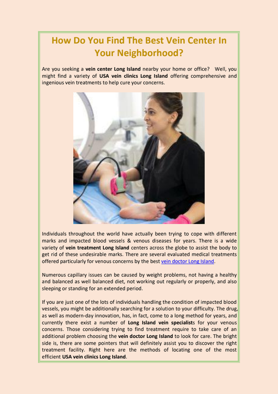 Varicose capillaries can be treated with several methods effectively in a varicose vein clinic Long Island. The preliminary and less invasive approach is taking advantage of compression stockings, in addition to, if this technique does not finish the development of varicose capillaries, there are numerous additional straight approaches to lowering their look.